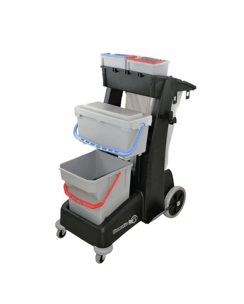 Chariot de lavage avec 2 seaux de 5 litres, un seau avec couvercle, 1 seau de 28L, avec collecteur de déchets et d’un rangement.